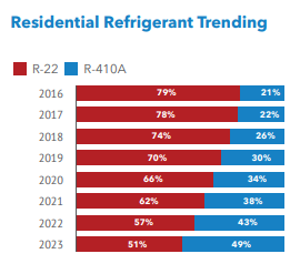 Data from the HVACi 2023 Annual Claims Report showed that the use of R-22 decreased in HVAC systems that HVACi assessed leading up to, and after, the ban on R-22 production.